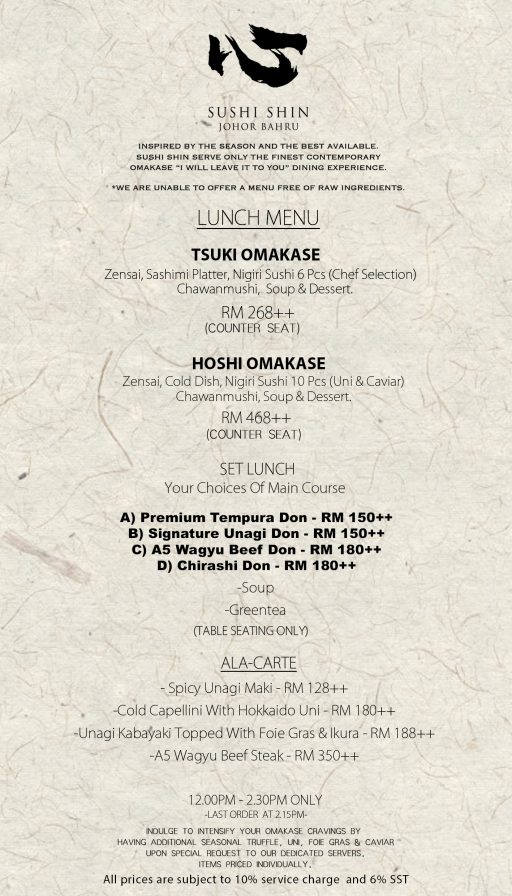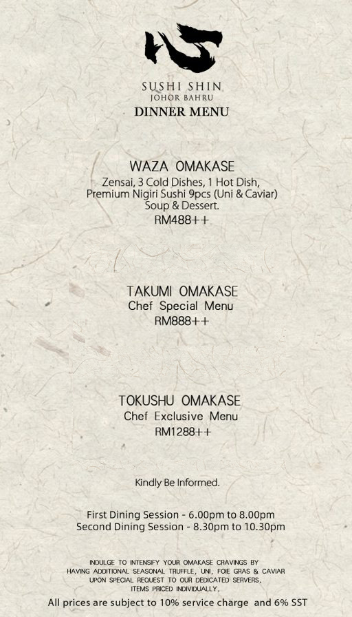 Inspired By The Season And The Best Available. Sushi Shin Serve Only The Finest & BEYOND THE BOUNDARIES Contemporary OmakasE IN JOHOR “I Will Leave It To You Dining Experience". We Are Unable To Offer A Menu Free Of Raw Ingredients.
